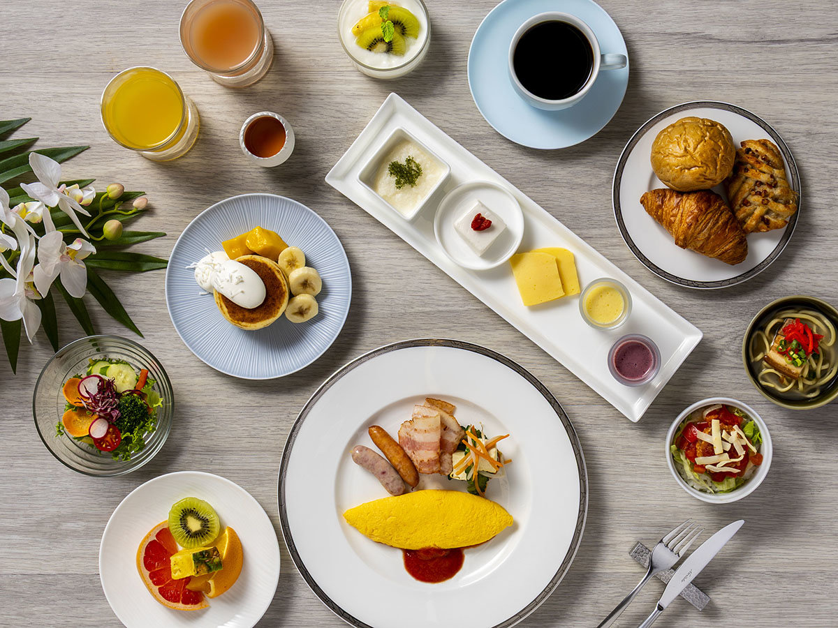 館内1階のダイニングレストランで朝食ビュッフェあり。沖縄の食材を取り入れた料理やライブキッチンでの調理など、リゾートらしい朝食体験が可能です。