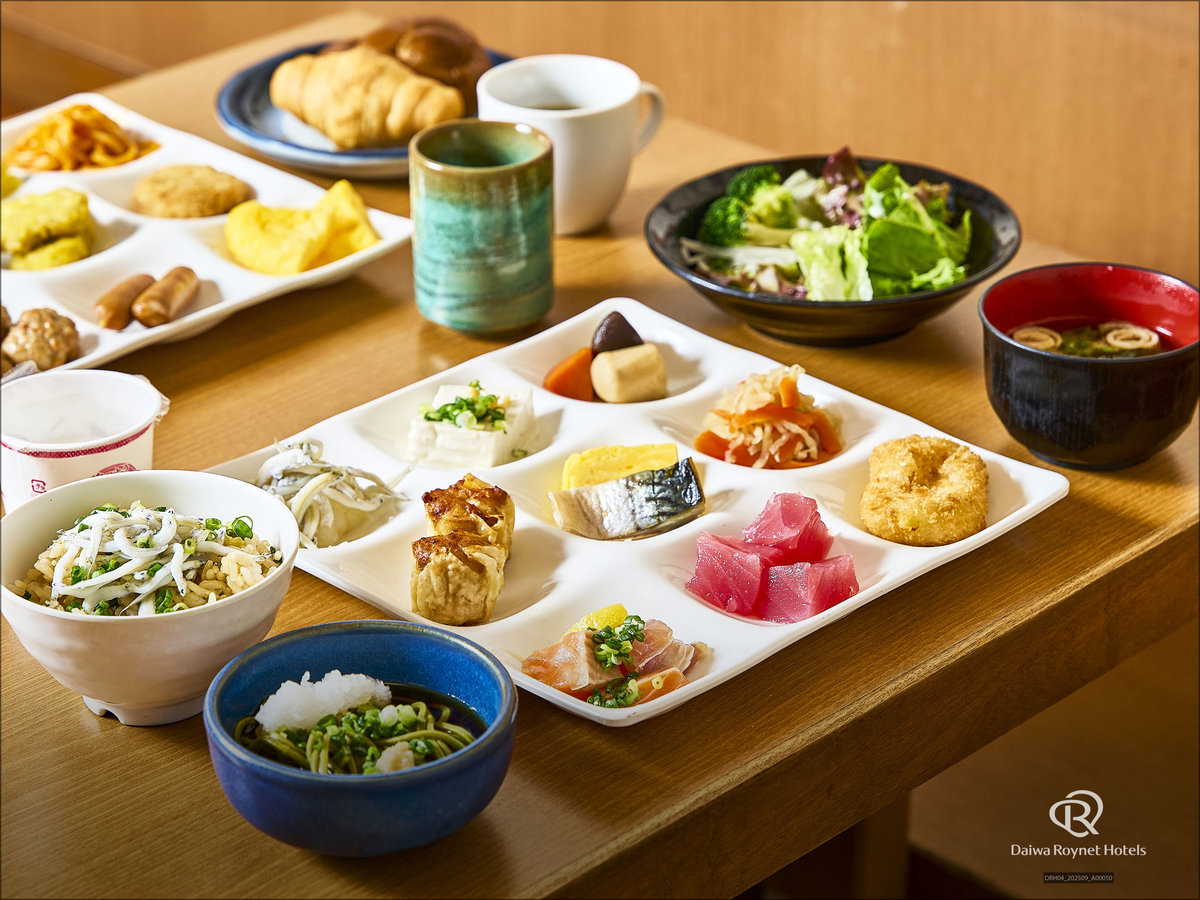 和洋バイキング形式で、地元食材を取り入れたメニューが楽しめます。品数も多く、朝からしっかり食べたい方におすすめです。